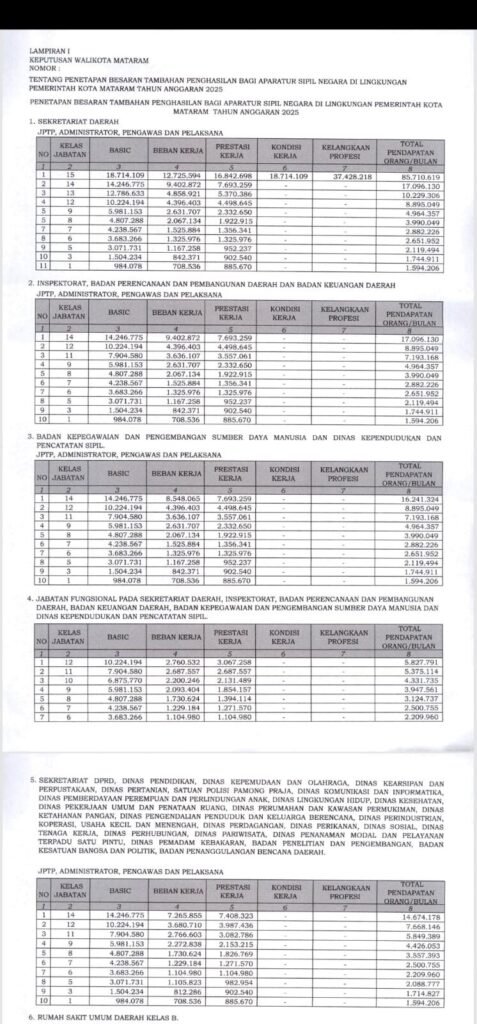 Diketahui, TPP sekda Kota Mataram naik drastis. Terakhir 2023 saat H Effendi Eko Saswito masih tercatat Rp 46 juta. Sejak tahun 2024 sudah empat kali revisi Perwal dan terbaru tahun 2025 terlampir jumlah TPP Sekda dan para Kepala Dinas.